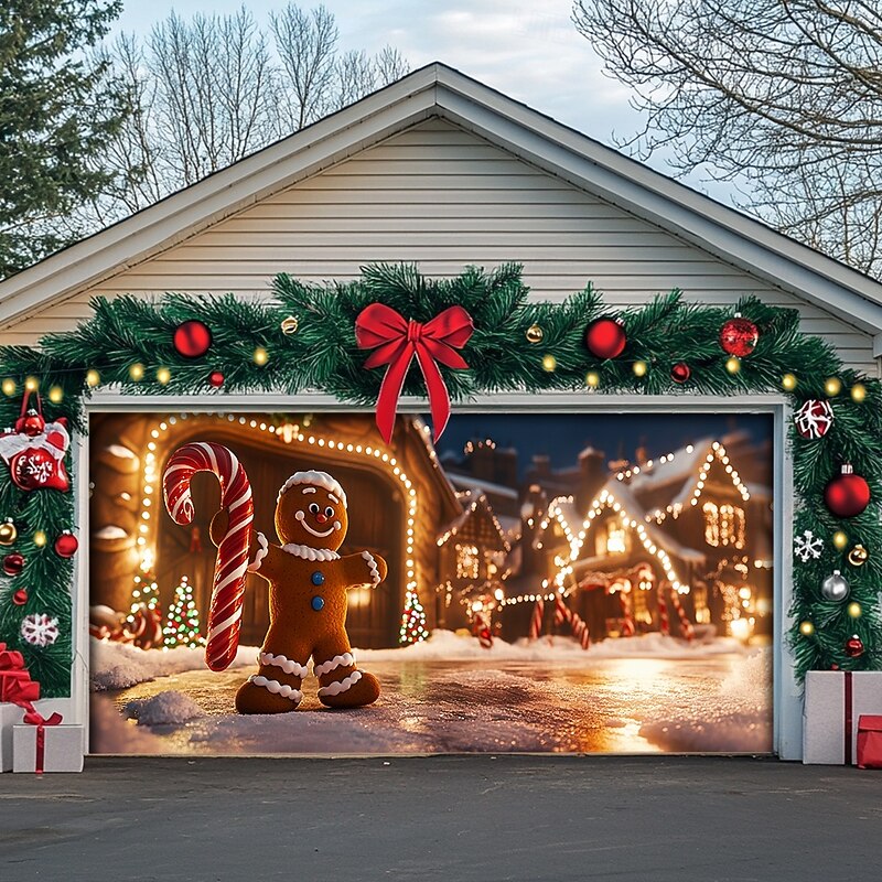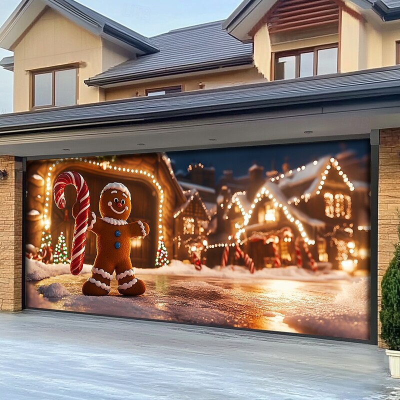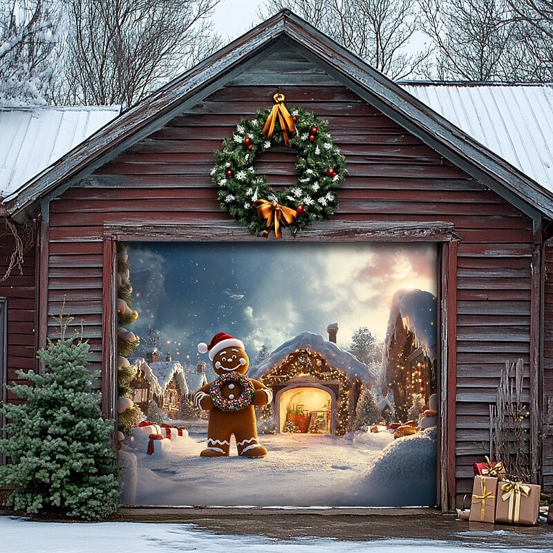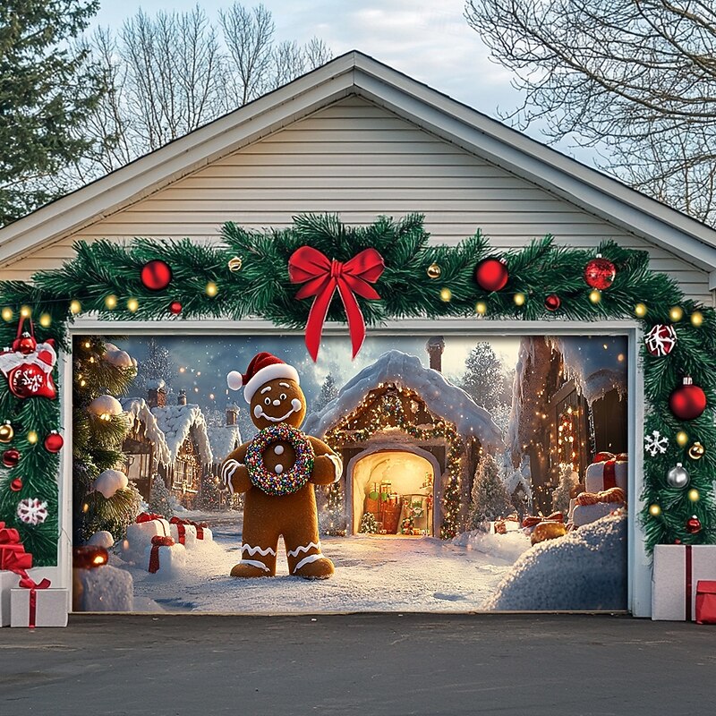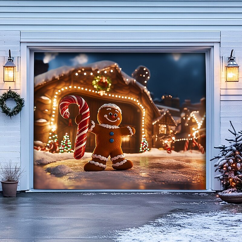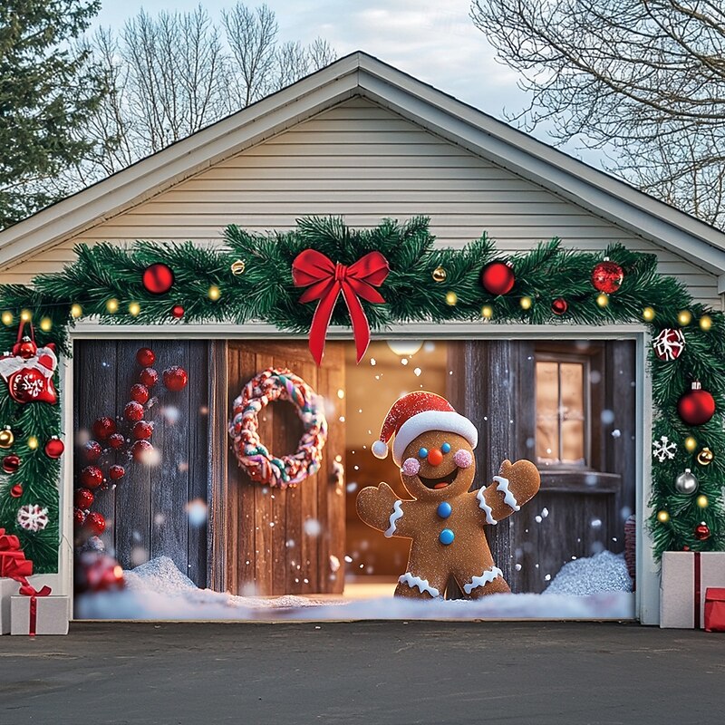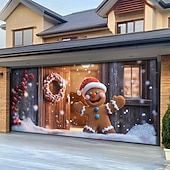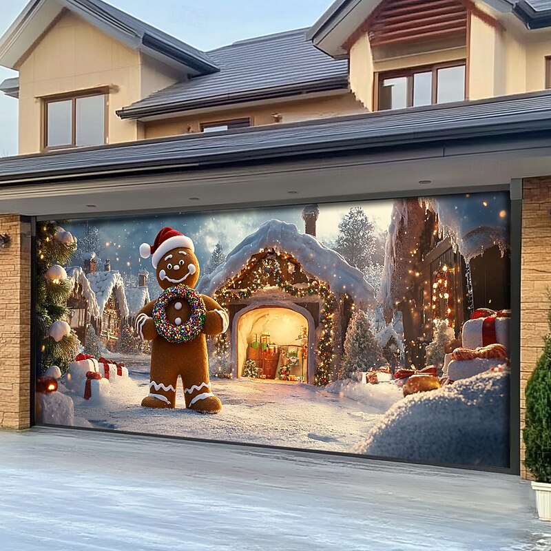 HOT ! Christmas Door Decorations Outdoor Garage Door Cover Xmas Banner Gingerbread Man Large Christmas Backdrop for Holiday Outdoor Garage Door Home Wall Decorations