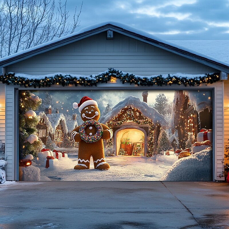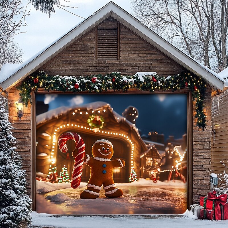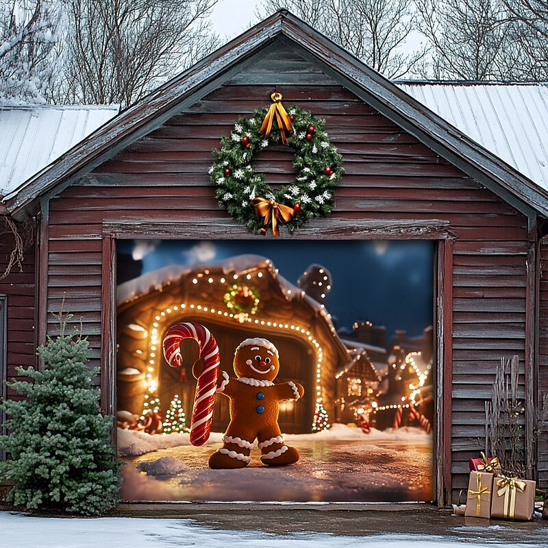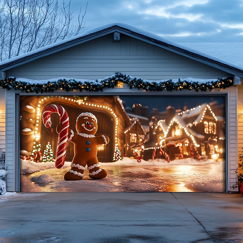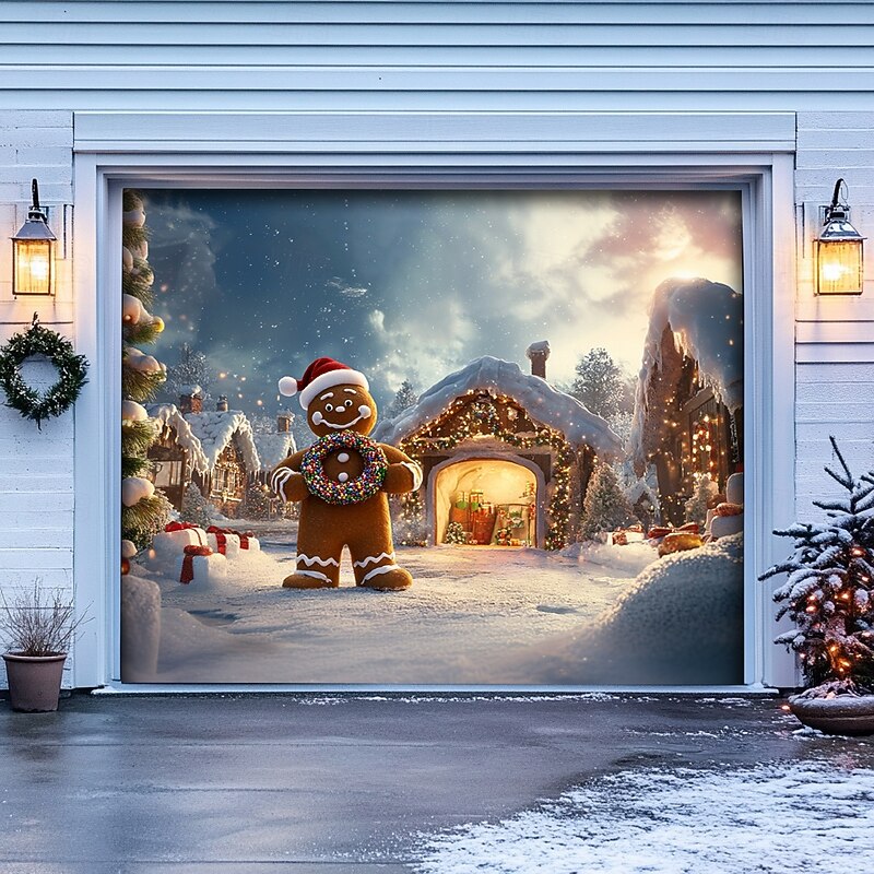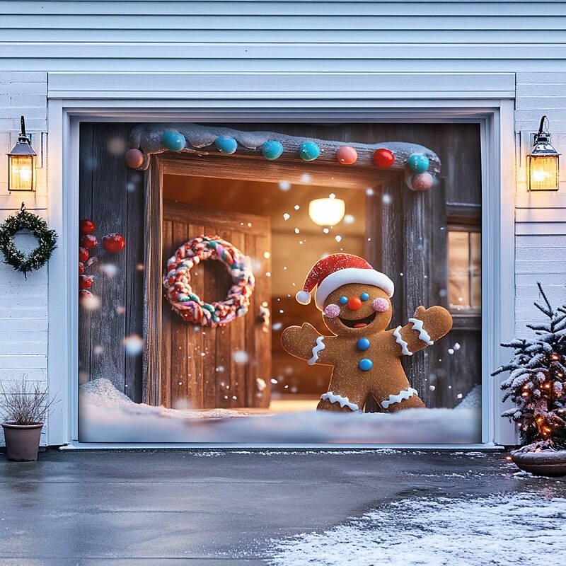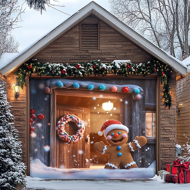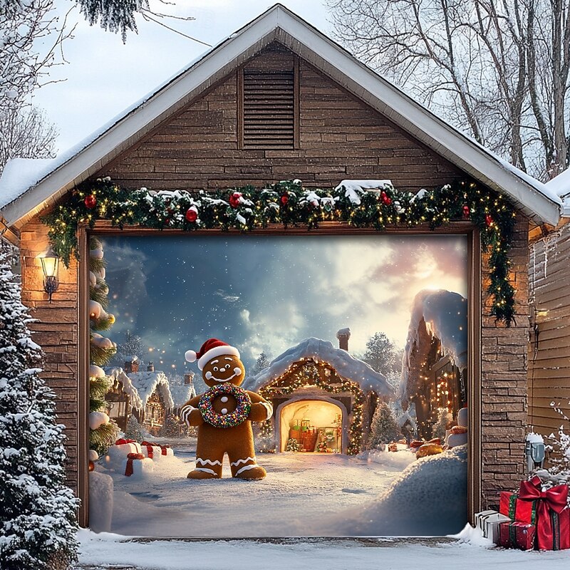HOT ! Christmas Door Decorations Outdoor Garage Door Cover Xmas Banner Gingerbread Man Large Christmas Backdrop for Holiday Outdoor Garage Door Home Wall Decorations