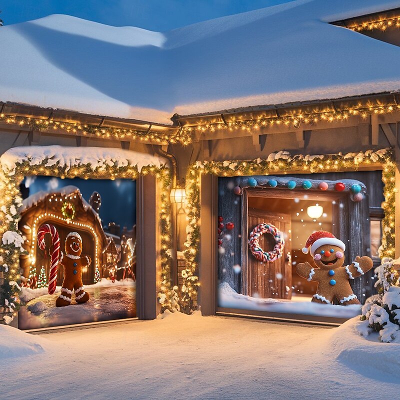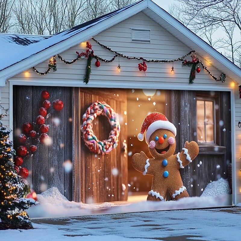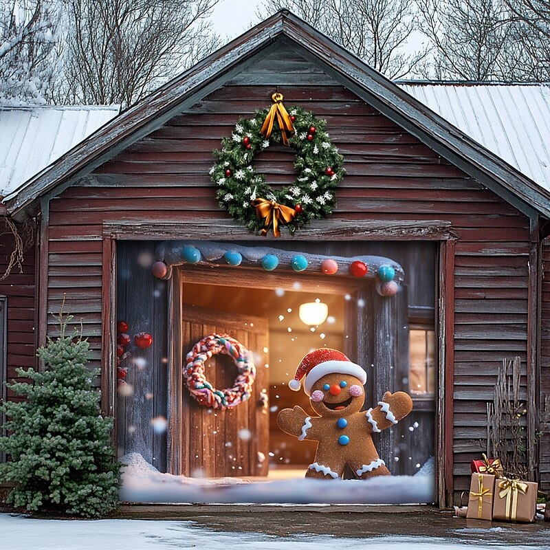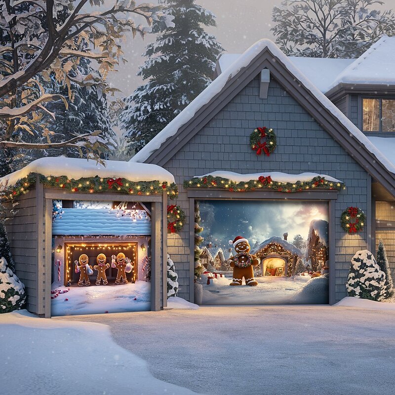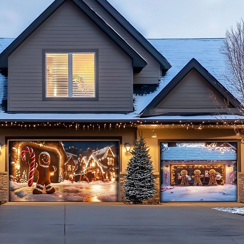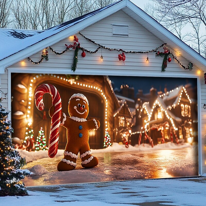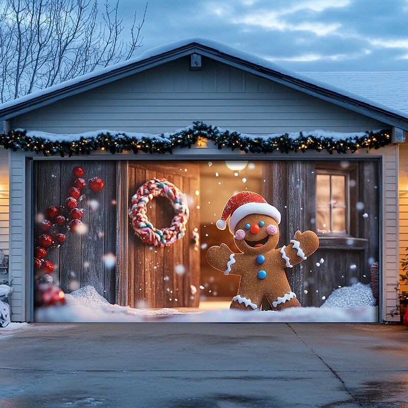 HOT ! Christmas Door Decorations Outdoor Garage Door Cover Xmas Banner Gingerbread Man Large Christmas Backdrop for Holiday Outdoor Garage Door Home Wall Decorations