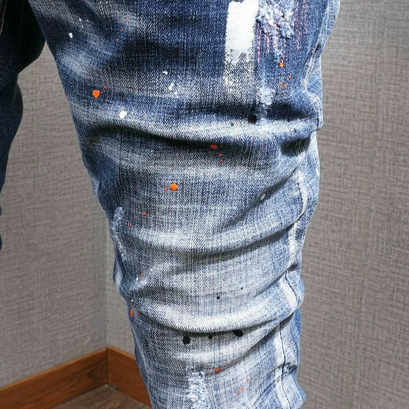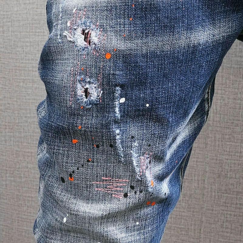 More information about Streetwear Men Jeans Retro Elastic Slim Fit Ripped Jeans Trousers Mens Painted Elastic Hip Hop Denim Pencil Pants