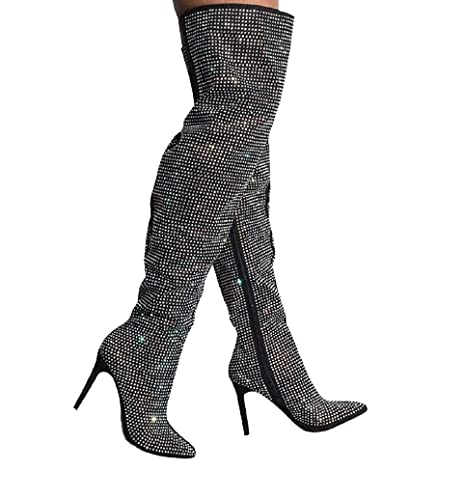 Anne Michelle Women's All Over Diamond Rhinestone Stripe Front Slouchy Thigh High Stiletto Boots 5