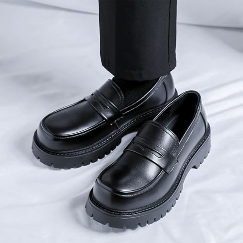Men's Classic Black Platform Loafers Round Toe Breathable Leather Slip On Work Shoes Comfort Non Slip Lug Sole Penny Shoes 7