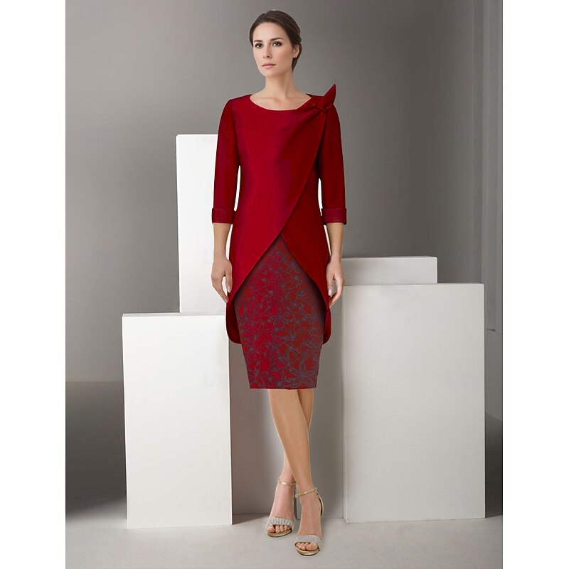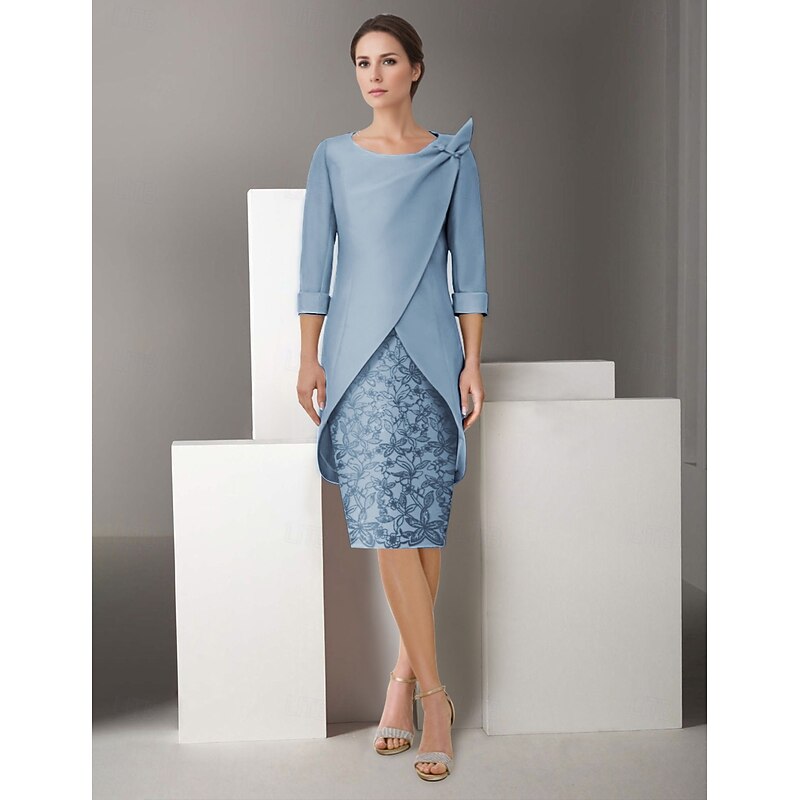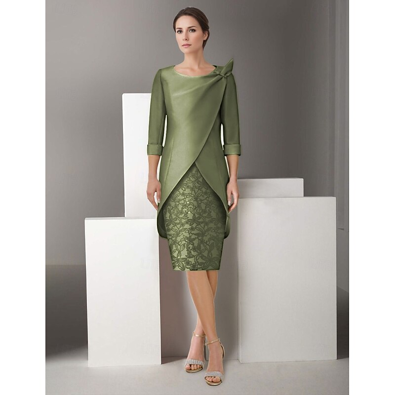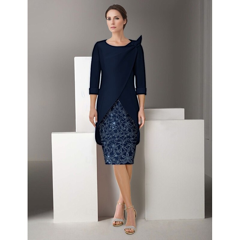Highlights [Fabric] : Crafted from a luxurious blend of satin and glitter lace, this two-piece sheath jacket dress suit offers an elegant and vintage appeal. The fabric combination provides a smooth, lustrous sheen complemented by delicate floral lace overlays for added sophistication. [Silhouette] : The ensemble features a sheath/column silhouette that ensures a flattering fit, with a knee-length hemline that embodies grace and elegance. This design exudes a timeless and chic appearance, perfect for those who appreciate classic style. [Design Highlights] : The top showcases a unique asymmetrical draped front with an elegant three-quarter sleeve design. A tasteful bow detail at the shoulder adds a chic touch, while the floral lace overlay on the skirt provides a romantic and feminine contrast to the smooth satin. [Occasions] : This dress is an excellent choice for wedding parties, semi-formal events, and other formal gatherings. Whether attending as the mother of the bride or participating in a special occasion, this ensemble ensures you make a stylish statement. [Size Range] : Available in a wide range of sizes from US 0 to US 26W, including the option for custom measurements. This allows for a personalized fit, ensuring comfort and elegance for various body types.