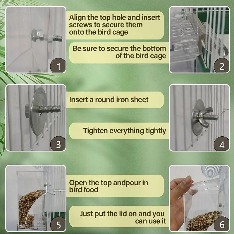 Highlights - No Mess Bird Feeder Food Container to keep your bird's cage clean - Large capacity can hold food for 7-15 days, perfect for when you're away - Transparent material for easy monitoring and refilling - Easy installation with no extra steps required - Designed specifically for birds' habits, suitable for a variety of small to medium birds
