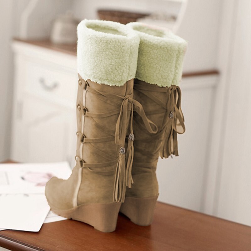 Women's Beige Knee - High Wedge Boots, Faux Shearling Lined with Tassel & Buckle Detail, Cozy & Stylish for Winter Casual Wear 5
