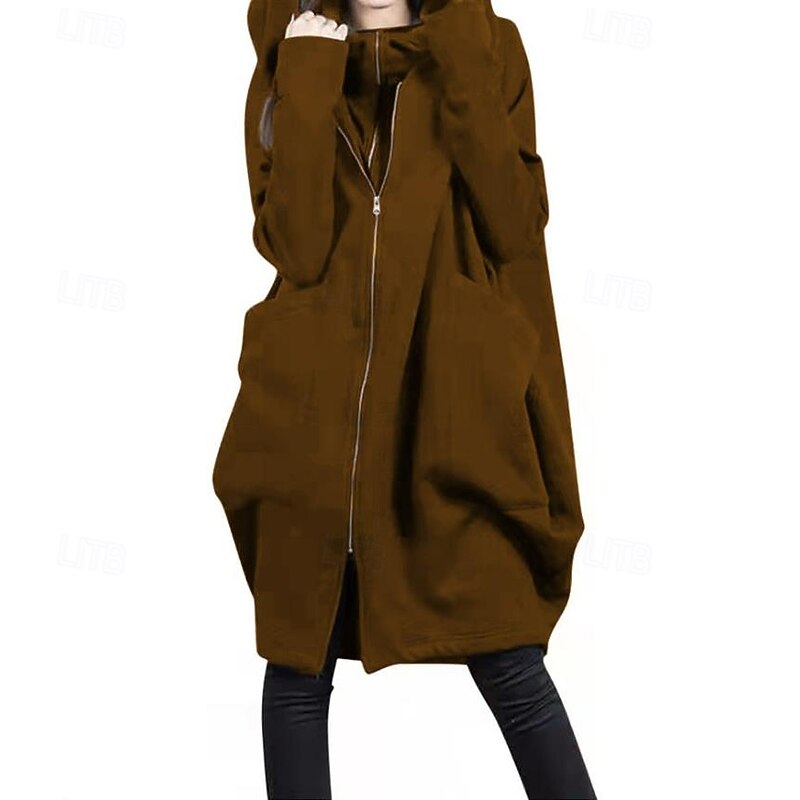 Highlights [Fabric & Fit] : Crafted from high-quality polyester, this women's outerwear offers a luxurious, micro-elastic fabric that promises warmth and comfort. Its loose fit design provides freedom of movement, making it ideal for layering during the colder seasons of fall and winter. [Design Highlights] : Showcasing a modern streetwear aesthetic, this jacket features a convenient front zipper closure and two spacious side pockets, adding both style and functionality. The generous hood and long sleeves enhance its windproof and cozy attributes, making it a perfect choice for those chilly days. [Occasions] : Versatile and stylish, this outerwear is suitable for a variety of settings including vacations, casual outings, or simply relaxing at home. Its solid dark brown color makes it easy to mix and match with different outfits for a laid-back yet fashionable look. [Size Range] : Available in a wide range of sizes from S to 2XL, ensuring a proper fit for everyone. This ensures you'll find the perfect match for your body type, providing both style and comfort. [Maintenance] : Designed for easy care, you can simply machine wash this jacket, making it a practical addition to your everyday wardrobe.
