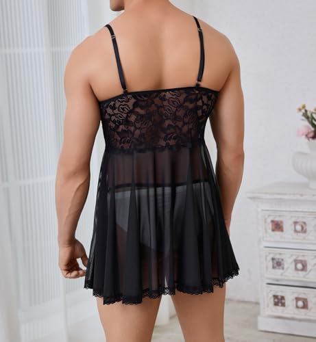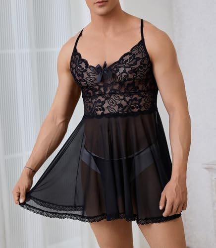 • Design: Mens sissy lingerie outfits, sissy underwear for men sheer lace nightdress mesh nightgowns, sissy crossdress lingerie nightwear for men, spaghetti strap sissy lace mesh lingerie dress for men, floral lace and mesh spliced design, sheer see through, sissy night dress for men. With adjustable straps for a better comfortable fit. Sheer mesh nightdress robe for men, with matching g-string panties,as nightwear or sleepwear.