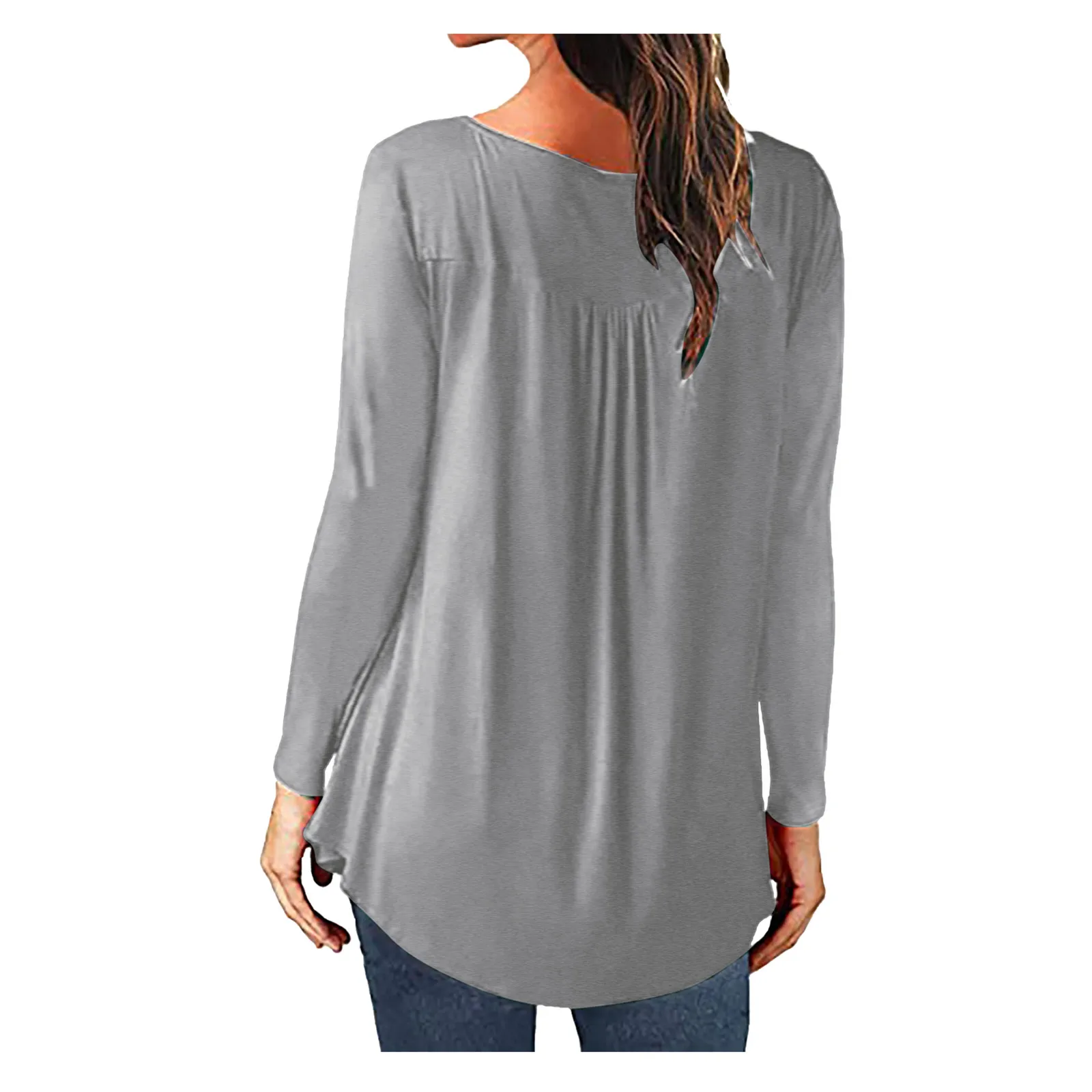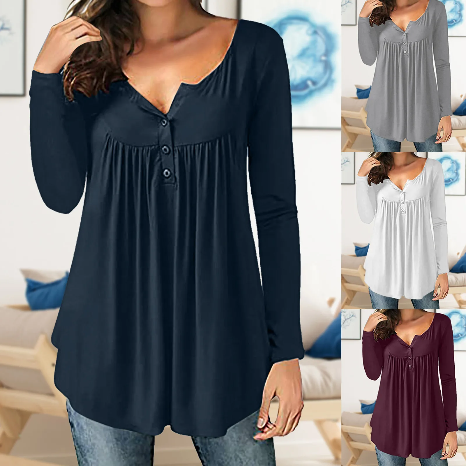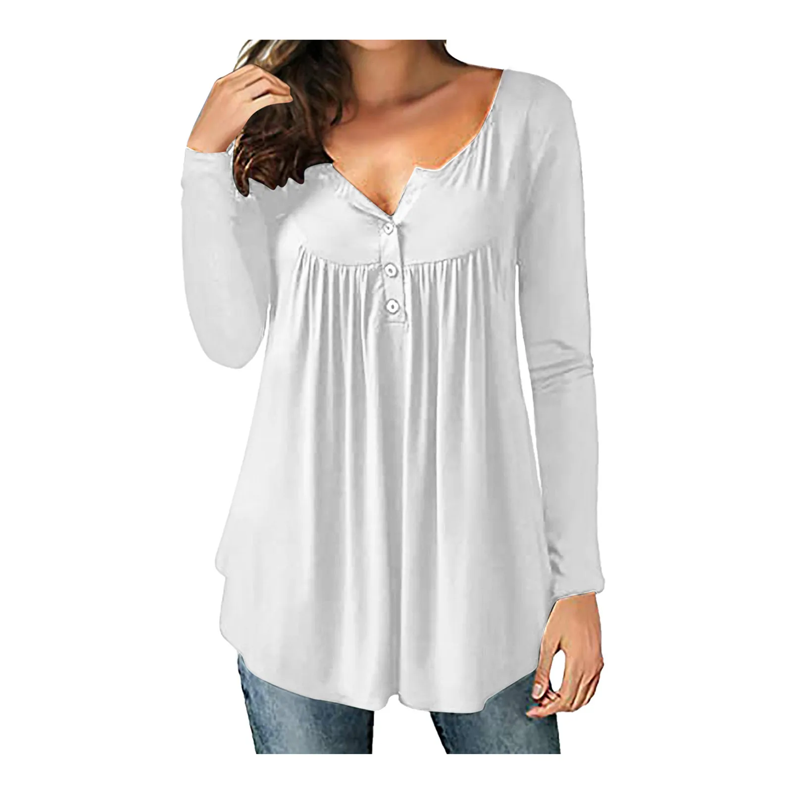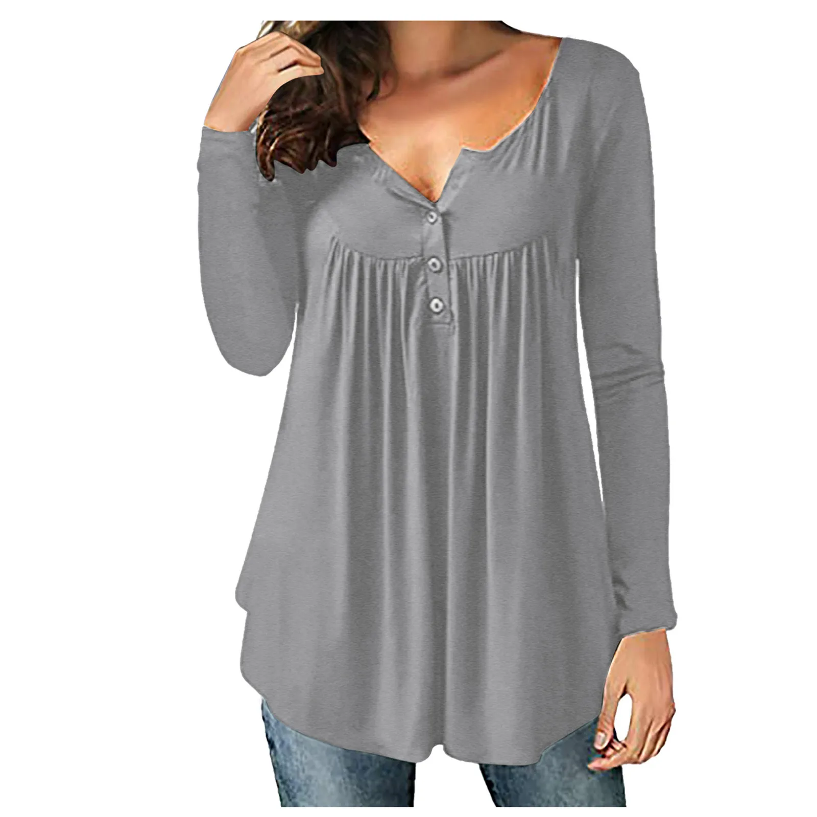 Summer Women Solid Print Tops Long Sleeve T-Shirts Tunic Pullover Button Round Neck Causal Blouse
