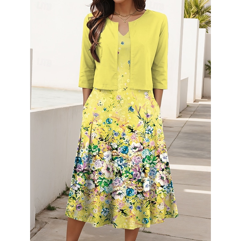 HOT ! Women's Two Piece Dress Sets Midi Dress with Jacket Elegant A Line Dress Half Sleeve Casual Semi Formal Ombre Floral Print V Neck Date Yellow Pink Blue Regular Fit