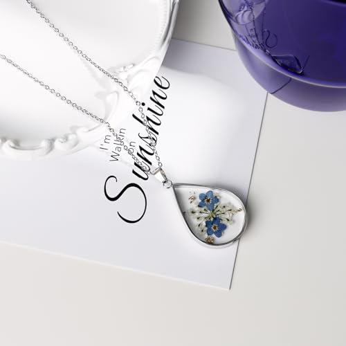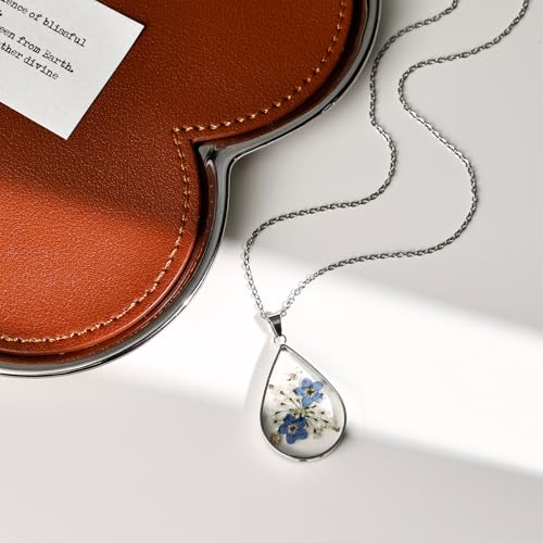 • Sterling Silver & Pressed Flower Art: Crafted with sterling silver this necklace features real pressed forget me not flowers encased in a teardrop pendant The delicate blue blooms showcase unique floral artistry