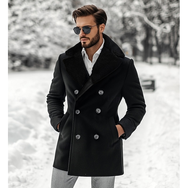More information about Men's Winter Jacket Wool Coat Coat Christmas Outdoor Fur Trim Buttons Winter Solid Color Christmas Elegant Fold-over Collar Regular Black Brown Jacket
