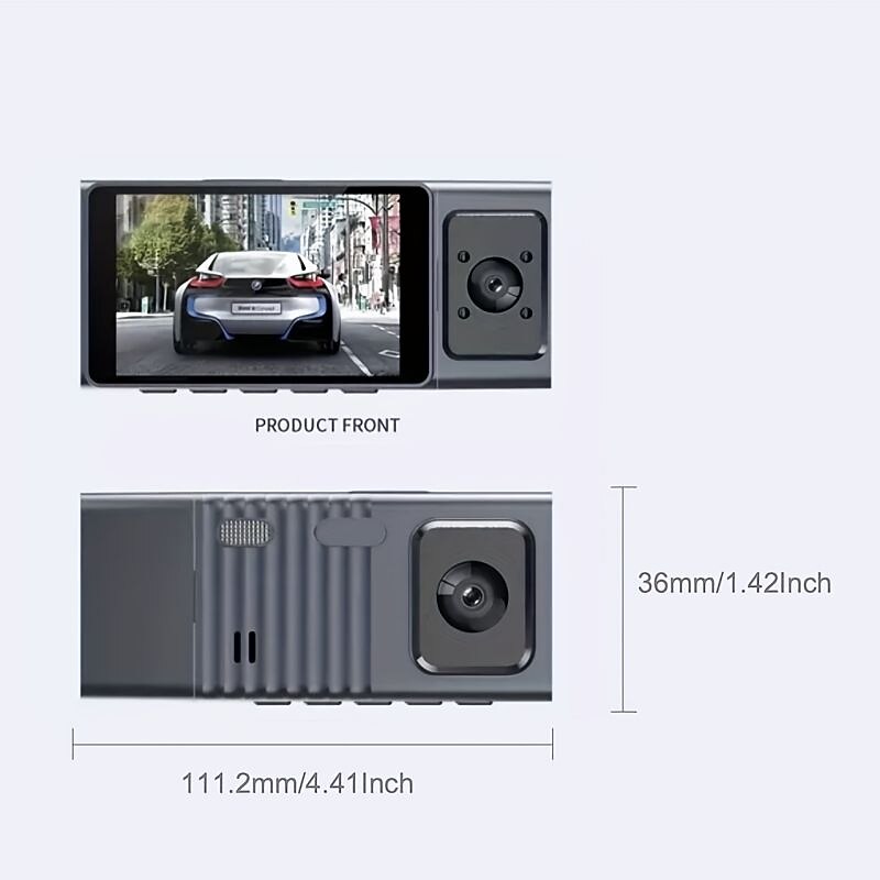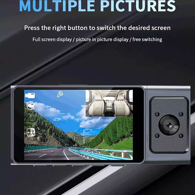 Highlights 1. Enjoy an ultra-large wide-angle fisheye lens in your car that covers the main driver and co-pilot with a 140° viewing angle, providing crystal-clear infrared night vision. 2. Experience superior picture and video quality with a stunning 3-inch high-definition display – 1.7 times better than traditional digital screens. Don't worry about grainy images anymore! 3. Rest easy when recording on the go with automatic seamless loop coverage. Choose your loop duration and never worry about your memory card filling up – older video recordings will be automatically overwritten. 4. Easily switch between different screens with just one key! Tap the right button to switch to the desired screen – full-screen display, picture-in-picture, or free switching – whatever you need for the perfect view.