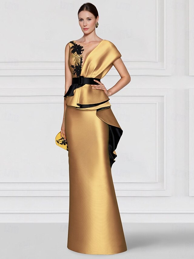 Highlights [Fabric] : This elegant dress is crafted from luxurious satin, providing a lustrous finish and a flattering drape. The smooth fabric ensures a comfortable fit for any formal occasion. [Silhouette] : Designed in a sophisticated sheath/column silhouette, the gown features a floor-length hemline that adds grace and elegance. The fitted style highlights the body's natural curves, making it a timeless choice. [Design Highlights] : The gown boasts a modern V-neckline, complementing its sleeveless design. The bodice is adorned with intricate appliques and embroidery in striking black and gold, accompanied by a contrasting black belt that cinches the waist. The asymmetric skirt is layered, with black fabric peeking through, adding texture and depth. [Occasions] : Perfect for formal events like evening gatherings and Christmas parties, this gown serves as a stunning statement piece suitable for any festive or formal occasion. [Size Range] : Available in a wide range of sizes from US 0 to US 26W, ensuring a perfect fit for various body types. Custom measurements are also an option, providing a tailored fit for those who prefer it.