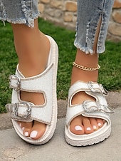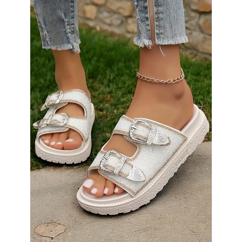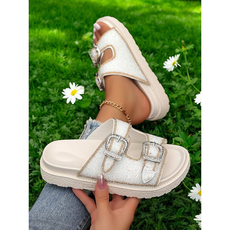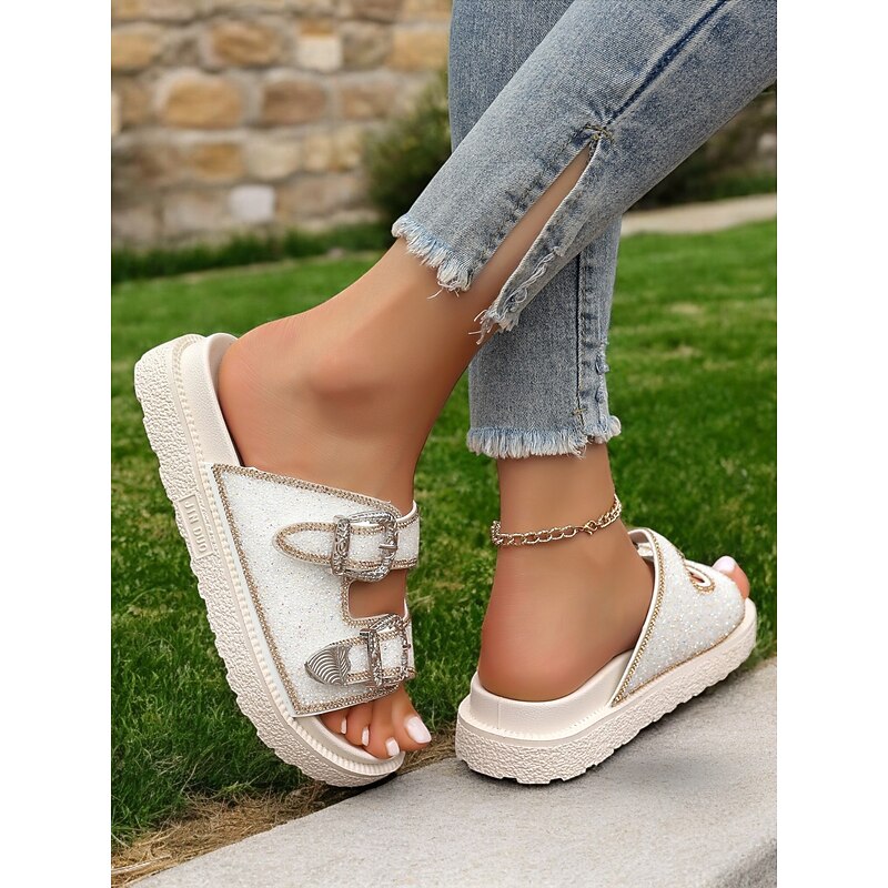 HOT ! Women's Buckle Platform Slide Sandals – Sparkly Open-Toe Slip-On Shoes with Rhinestone Accents for Casual & Party Wear