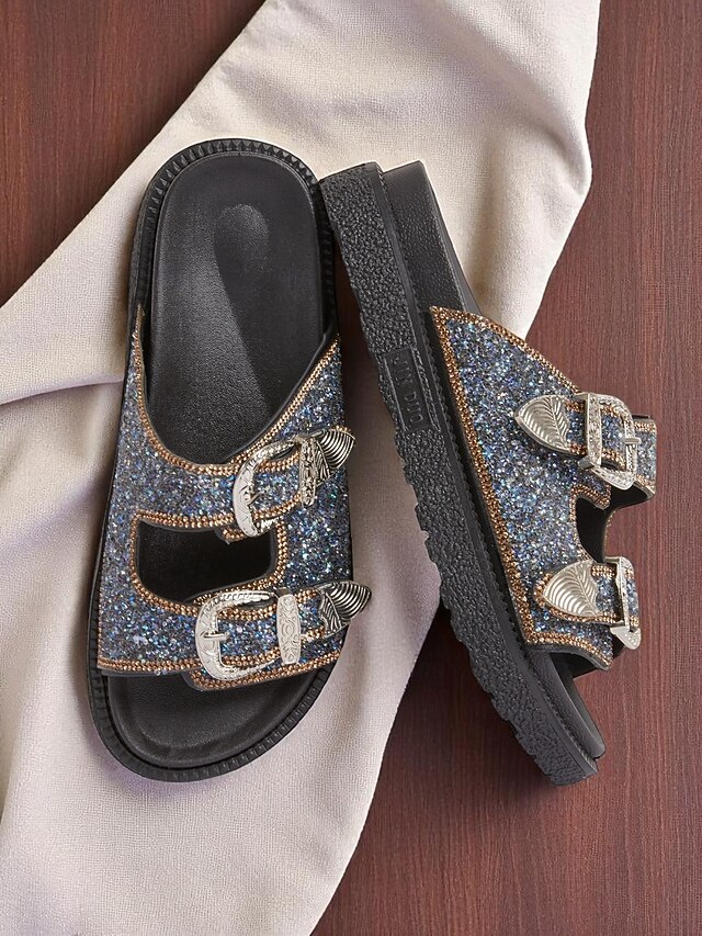 Women's Buckle Platform Slide Sandals – Sparkly Open-Toe Slip-On Shoes with Rhinestone Accents for Casual & Party Wear 12