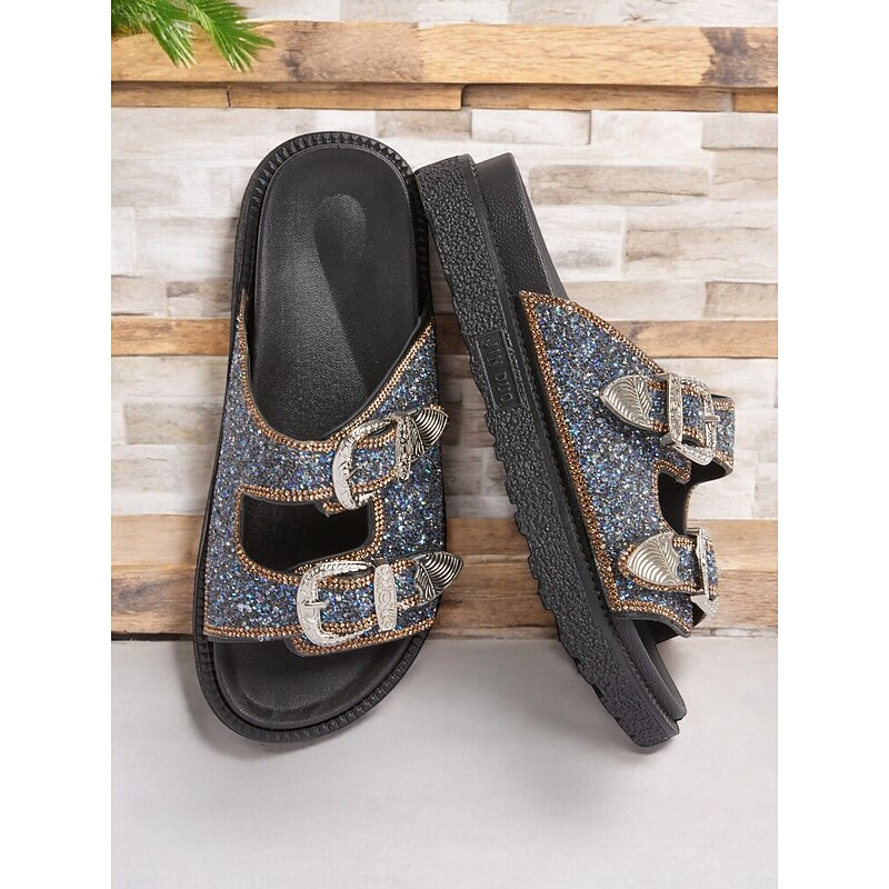 Women's Buckle Platform Slide Sandals – Sparkly Open-Toe Slip-On Shoes with Rhinestone Accents for Casual & Party Wear 1