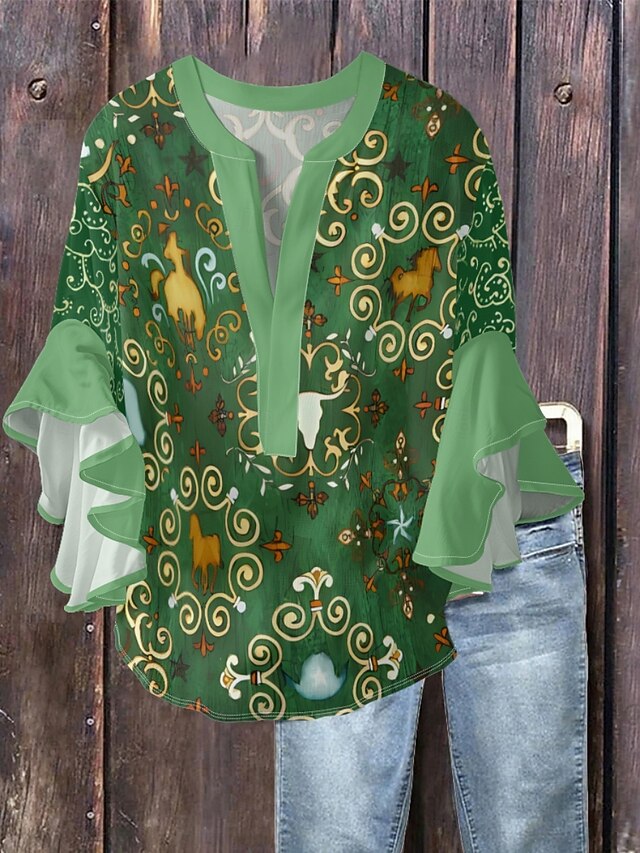 HOT ! Women's Blouse Floral Stylish Modern 3/4 Length Sleeve V Neck Regular Tops Daily Holiday Ruffle Print Pink Blue Orange Green Summer