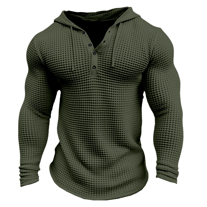 Highlights [Fabric]: Crafted from high-quality polyester, this men's waffle-knit hoodie offers a soft, textured feel that ensures both comfort and warmth. Its micro-elastic properties allow for ease of movement, making it a versatile addition to any wardrobe. [Fit]: The hoodie features a regular fit, designed to enhance the wearer's physique while providing a tailored and snug appearance. Its long sleeves contribute to a comfortable and stylish silhouette, suitable for layering or wearing alone. [Design Highlights]: This hoodie combines casual style with functional design elements. It includes a practical hood with adjustable drawstrings for personalized comfort, and a button-up neckline that adds a touch of sophistication. The plain pattern and simple lines make it a classic choice for everyday wear. [Occasions]: Perfect for various settings, this hoodie is ideal for vacations, street outings, casual daily activities, and other leisurely events. Its basic yet fashionable style makes it suitable for multiple occasions, from laid-back weekends to casual get-togethers. [Size Range]: Available in a wide range of sizes, from S to XXXL, this hoodie provides options for different body types and ensures a perfect fit for adult men. With three versatile color choices – White, Gray, and Army Green – it caters to diverse style preferences.