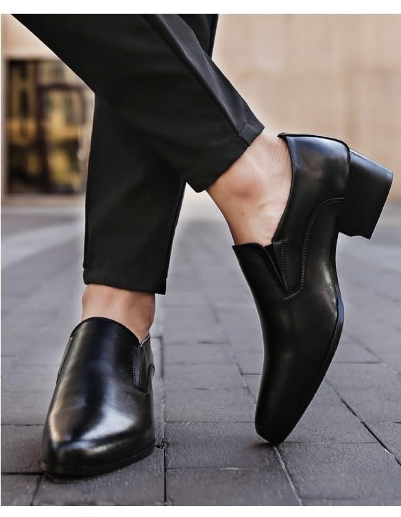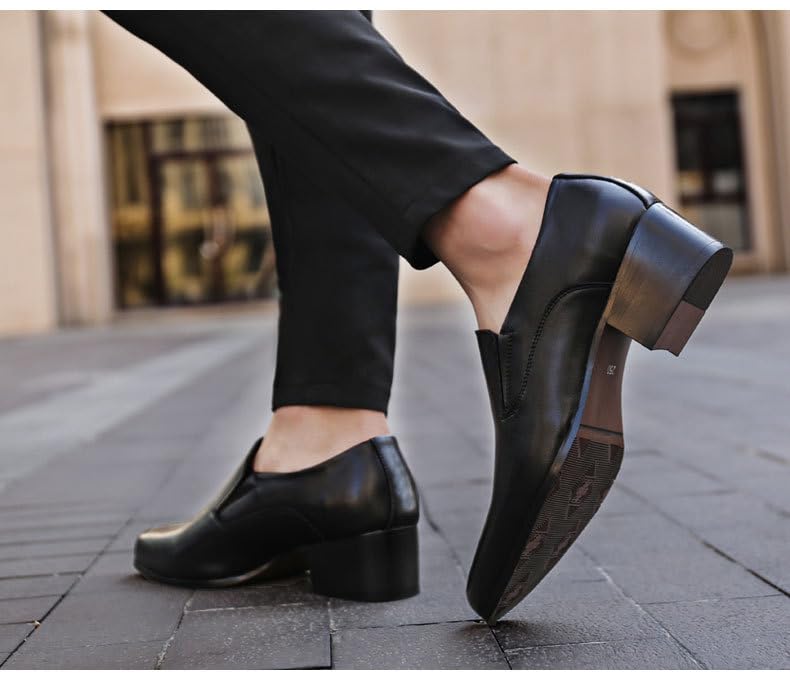 HOT ! Battle Men Men's Leather Slip-On Dress Shoes with Pointed Toe, Chunky Heel, 2-Inch Elevator Shoes for Business or Wedding Events