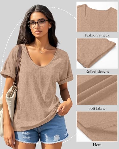 Riyiper 3 Pack Women's V Neck Shirt, Summer Rolled Sleeve Solid Tops Casual Loose Tees Lightweight Basic Soft Tshirt 4