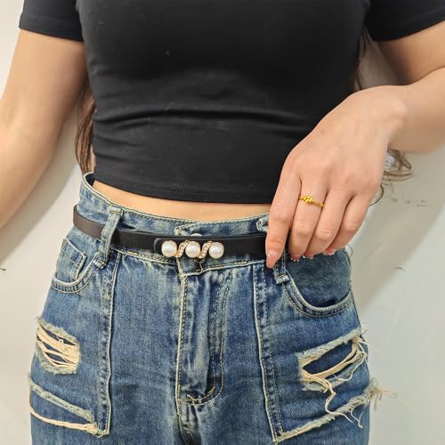 Skinny Black Belt Gold Buckle for Women Leather Thin Belt for Dress Pants Jeans Wedding Pearl Belt for Bride Dresses 3