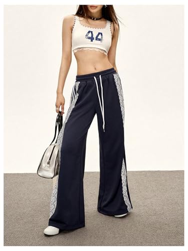 HOT ! MakeMeChic Women's Floral Lace Striped Pants Drawstring Wide Leg Y2k Sweatpants Trousers
