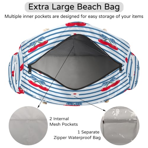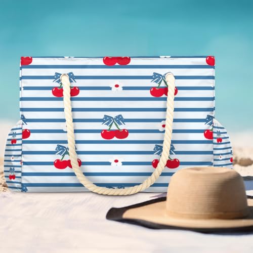 HOT ! Striped Cherry Beach Bag for Women Waterproof Sandproof Tote with Zipper Cotton Rope Handles for Travel Pool Gym Shopping