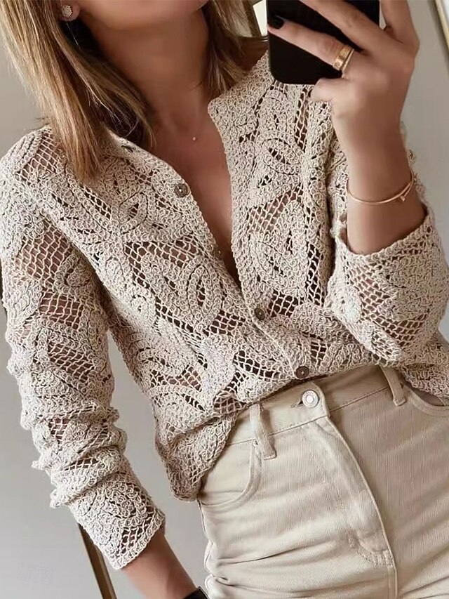 Women's Blouse Solid Color Basic Casual Long Sleeve Crew Neck Regular Tops Daily Hollow Out Buttons Khaki Fall Winter 1
