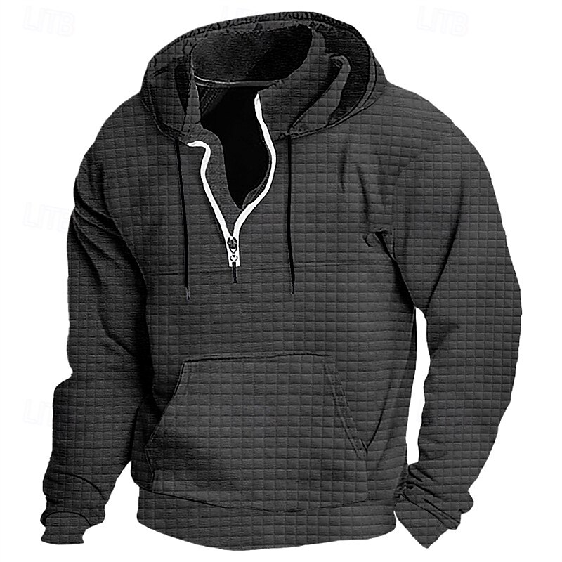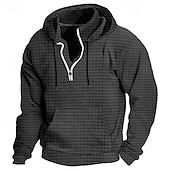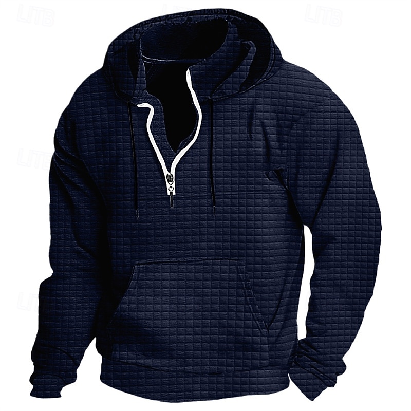Highlights [Fabric] : Crafted from a durable blend of polyester and waffle fabric, this men's hoodie offers a micro-elastic texture for added comfort and versatility. The quilted texture not only enhances visual appeal but also provides excellent insulation for cooler days. [Fit] : Designed in a regular fit, this hoodie caters to those seeking a balanced silhouette that offers both style and comfort. The relaxed fit ensures ease of movement, making it suitable for daily wear. [Design Highlights] : This hoodie showcases a quarter-zip neckline, providing adjustable coverage to suit your preference. The large drawstring hood offers additional protection against the elements, while the kangaroo pocket at the front provides practical storage and a cozy spot for hand warmth. [Occasions] : Perfect for spring and fall, this basic yet stylish hoodie is ideal for casual and streetwear purposes. Whether you are engaging in outdoor activities, enjoying holiday festivities, or simply going about your daily routine, this hoodie meets a variety of lifestyle needs. [Size Range] : Available in a range of sizes from M to 3XL, ensuring a comfortable fit for a wide audience, and offered in versatile colors like Black, White, Wine, Army Green, and Navy Blue to suit various style preferences.