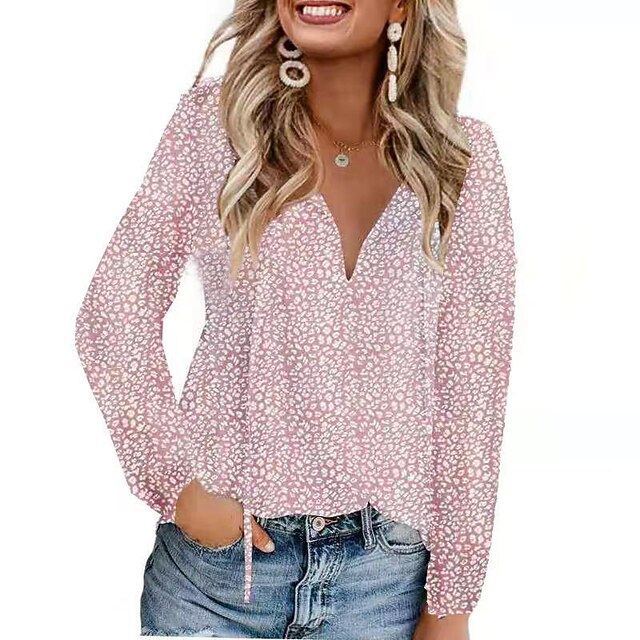 Highlights [Fabric] Crafted from lightweight chiffon, this women's blouse offers a breathable and comfortable wear ideal for the mild climates of spring and fall. The delicate lace-up design adds a charming touch to its fabric, which includes a micro-elasticity for easy movement. [Fit] This blouse presents a relaxed fit, making it a versatile choice for casual and streetwear styles. Its regular length pairs effortlessly with jeans or skirts, promising a laid-back yet chic appearance. [Design Highlights] The blouse features a playful leopard and polka dot print in pastel pink, enhancing its casual vibe with a splash of fun and color. The V-neckline adds a feminine touch, and the lace-up detail provides a modern, fashion-forward appeal. [Occasions] Perfect for daily casual outings, weekends, holidays, and streetwear fashion, this blouse adds flair to any occasion. Its stylish design makes it suitable for a variety of settings, from relaxed weekend get-togethers to casual dinners. [Size Options] Available in a range of sizes from S to 2XL, this blouse accommodates different body types, ensuring a comfortable and flattering fit for everyone.