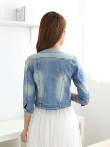 Women's Short Denim Jacket Round Neck Denim Three Quarter Sleeves Light Blue Jacket 7