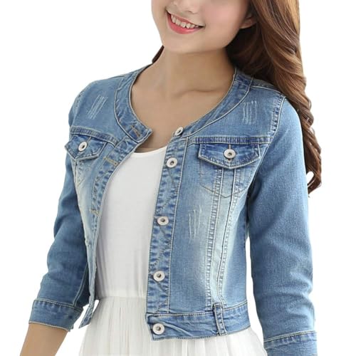 HOT ! Women's Short Denim Jacket Round Neck Denim Three Quarter Sleeves Light Blue Jacket