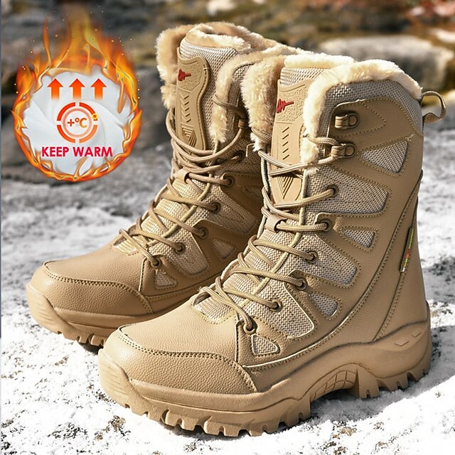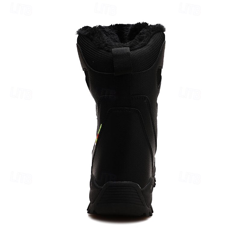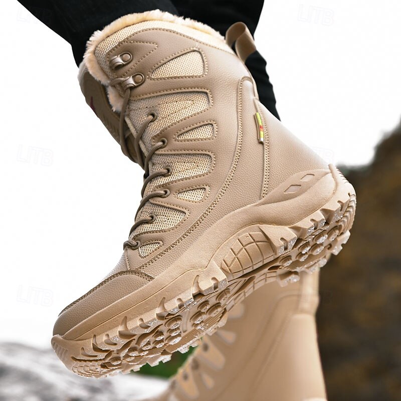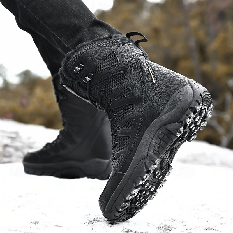 Highlights [Fabric] : Crafted with water-resistant PU leather and nylon, these men's winter boots offer both durability and protection against harsh weather conditions. The high-quality materials ensure rugged performance in outdoor settings. [Fit] : The high-top design delivers optimal ankle support, suitable for navigating snowy and icy terrains. The lace-up closure system allows for a customizable and secure fit, catering to prolonged wear. [Design Highlights] : These tactical boots feature a plush faux fur lining for exceptional insulation, keeping feet warm even in the chilliest climates. The round toe and deep tread rubber outsole offer added comfort and slip resistance, ensuring stability on slippery surfaces. [Occasions] : Perfect for outdoor hiking, skiing, or any winter adventures, these boots excel in cold-weather environments. Whether tackling snowy trails or bustling city streets, they provide a blend of functionality and stylish appeal. [Size Range] : Available in sizes US7 to US11, these boots cater to a variety of foot sizes, ensuring a great fit for many.