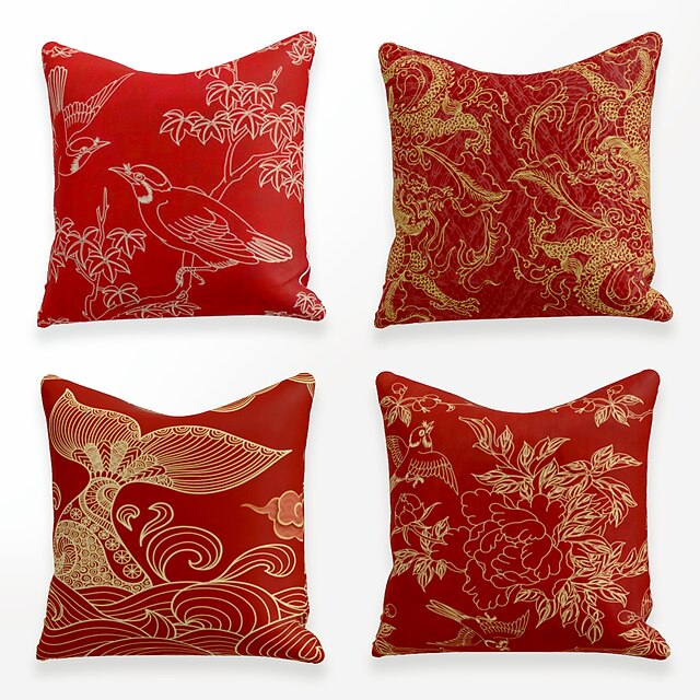 HOT ! Chinese Style Red Gold Cushion Cover 4PCS Soft Square Throw Pillow Cover Faux Linen Cushion Case Pillowcase for Sofa Bedroom 45 x 45 cm (18 x 18 Inch) Superior Quality Mashine Washable