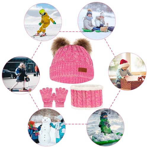 Kids Winter Beanie Hat Scarf Gloves Set,Toddlers Knit Winter Warm Double Pompom Cap Scarf Gloves for Girls Boys 1-5 Years Old 6