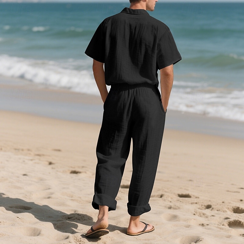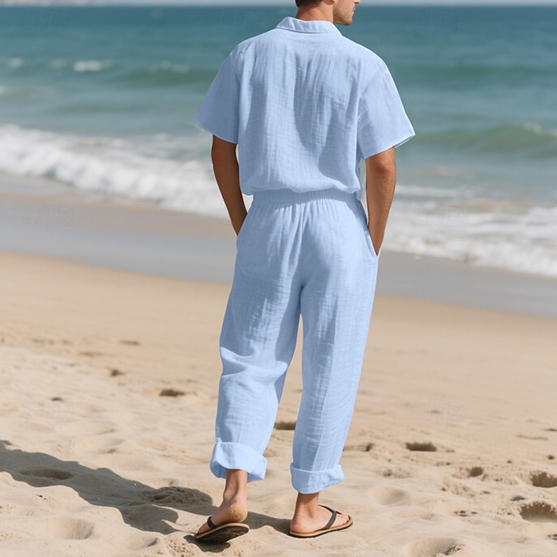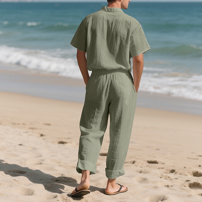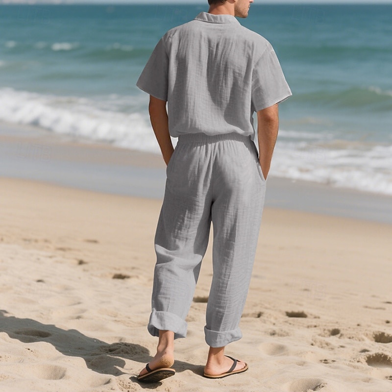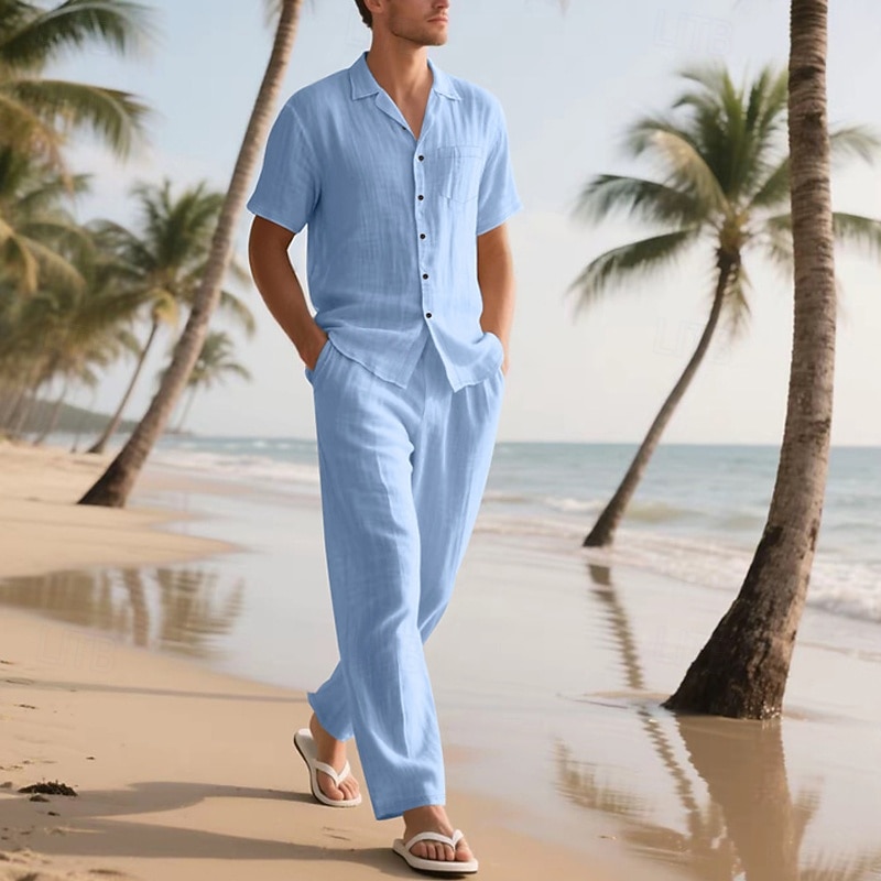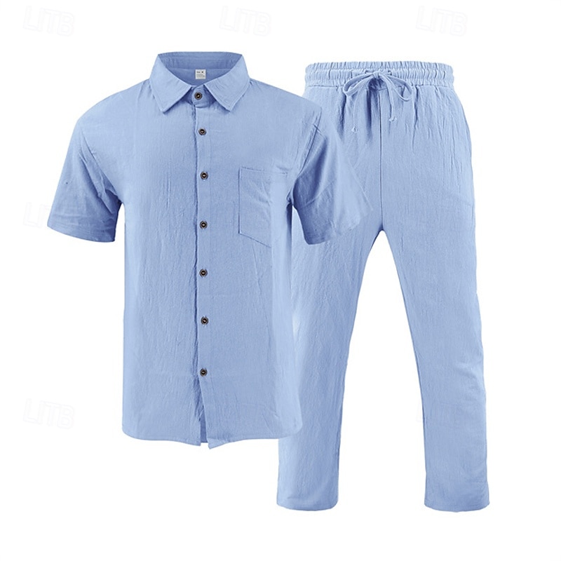 Highlights - Stay cool and stylish this summer in our linen short sleeve outfit for men - Perfect for casual occasions and vacations - Featuring a classic lapel neckline - Get 2 pieces in one with this versatile outfit - Elevate your summer wardrobe with this must-have ensemble