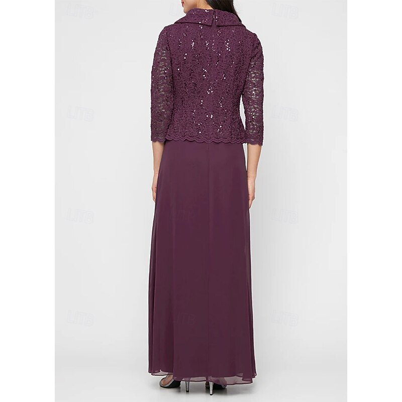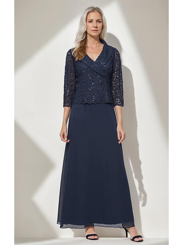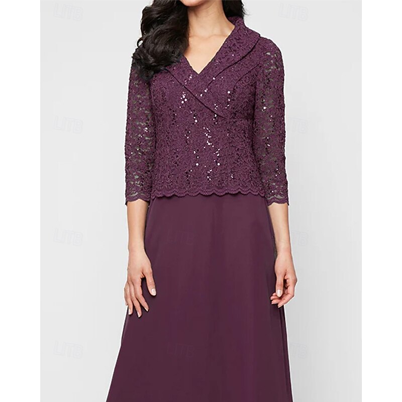 More information about A-Line Mother of the Bride Dress Portrait Collar Elegant Simple Minimalist V Neck Floor Length Chiffon Sequin Lace 3/4 Length Sleeve with Scalloped Hem