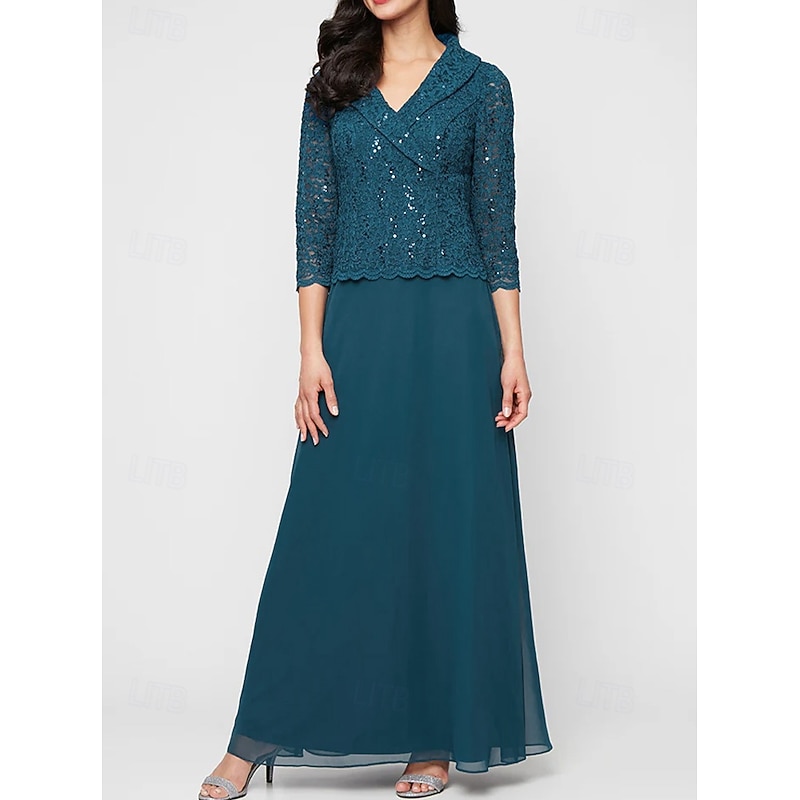 A-Line Mother of the Bride Dress Portrait Collar Elegant Simple Minimalist V Neck Floor Length Chiffon Sequin Lace 3/4 Length Sleeve with Scalloped Hem 2