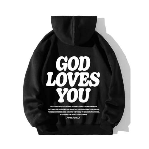 HOT ! Christian Hoodie for Men God Loves You Letter Print Crewneck Causal Sweatshirt with Pocket Fall Drawstring Aesthetic Hoodies