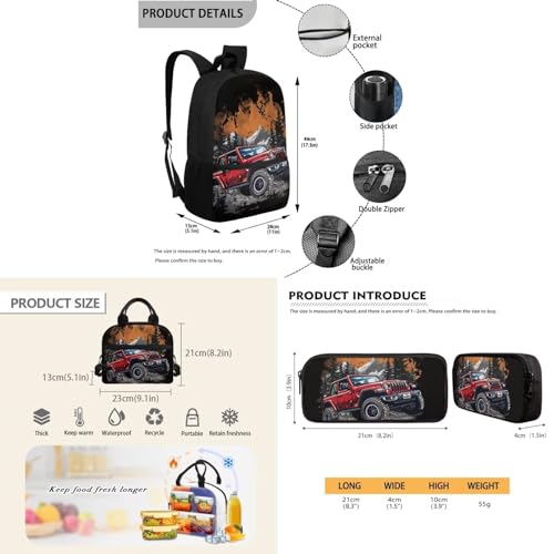 3pcs Backpack Sets Jeep for Kindergarten,Elementary Middle school Large Capacity Adjustable Shoulder Strap School Bag With Lunch Box Pencil Case 7