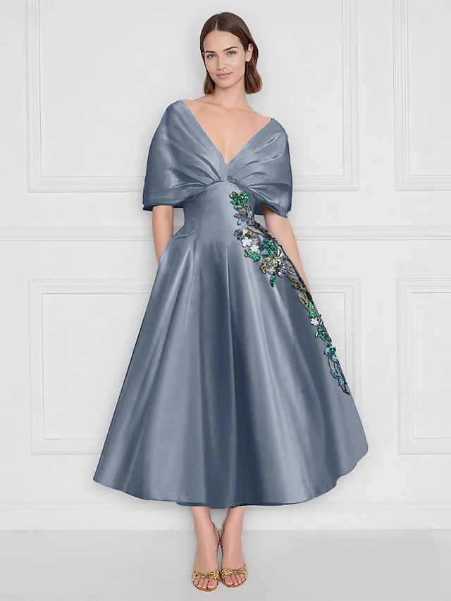 More information about A-Line Cocktail Dresses Elegant Dress Formal Wedding Ankle Length Short Sleeve Off Shoulder Satin with Floral Print Embroidery Pocket
