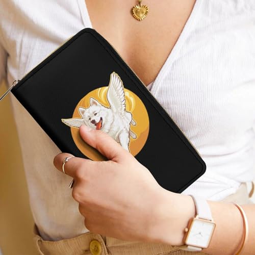 American Eskimos Dog Running Angel Wings Wristlet Wallets for Men Women Leather Purse Clutch Cute Card Holder 2