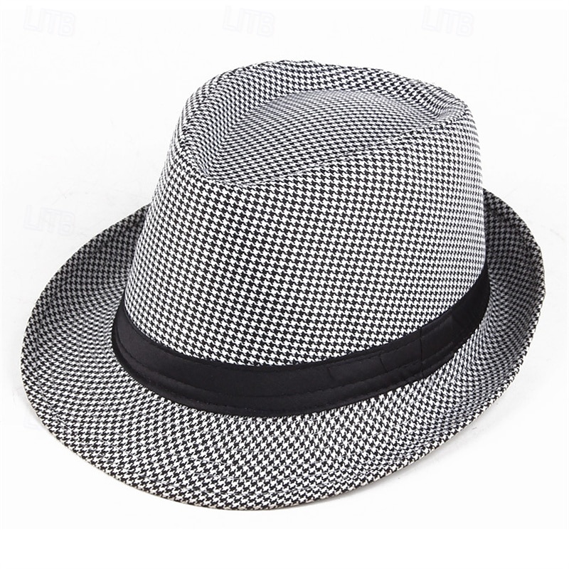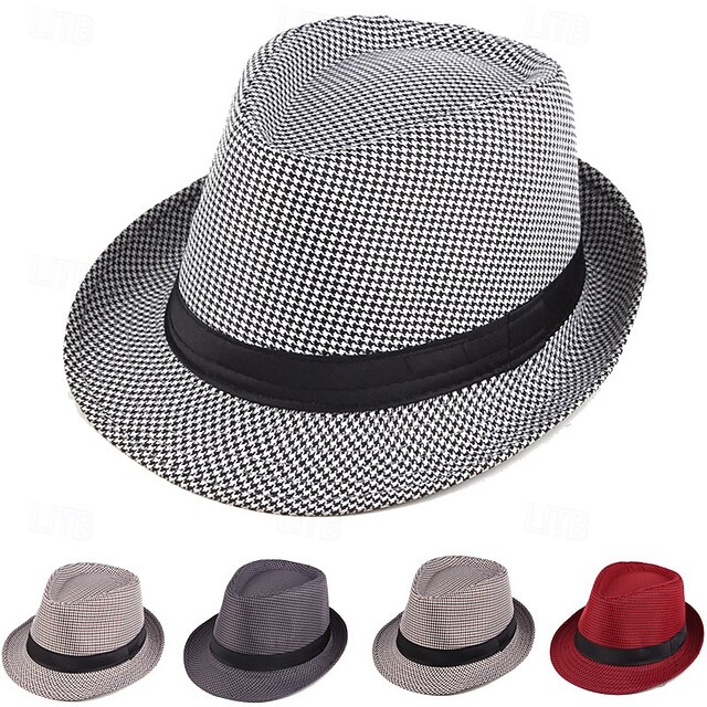 Highlights [Fabric] : Expertly crafted from durable and lightweight polyester, this fedora offers exceptional comfort and breathability, making it suitable for extended wear throughout the day. [Silhouette] : Embrace a timeless style with the fedora's classic silhouette, featuring a pinched crown and a neatly structured wide brim, providing a fashionable yet functional sunshade. [Design Highlights] : Showcasing a traditional houndstooth pattern, the hat is accentuated with a contrasting black band around its base, lending an air of sophistication and elegance to any ensemble. [Occasions] : Ideal for a variety of settings, this versatile hat complements both casual and formal wear, making it perfect for summer outings, daily streetwear, or any occasion calling for a touch of fashion-forward elegance. [Size] : Designed to fit most with its one-size configuration, this hat offers a comfortable and accommodating fit for a range of head sizes. Available in colors such as black, red, dark gray, yellow, and khaki, you can choose the perfect shade to match your wardrobe.