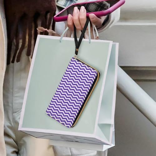 HOT ! Purple And White Wavy Stripes Wallet Wristlet Zipper Purse with Hand Strap Travel Credit Card Holder for Adult Daily Use Gifts
