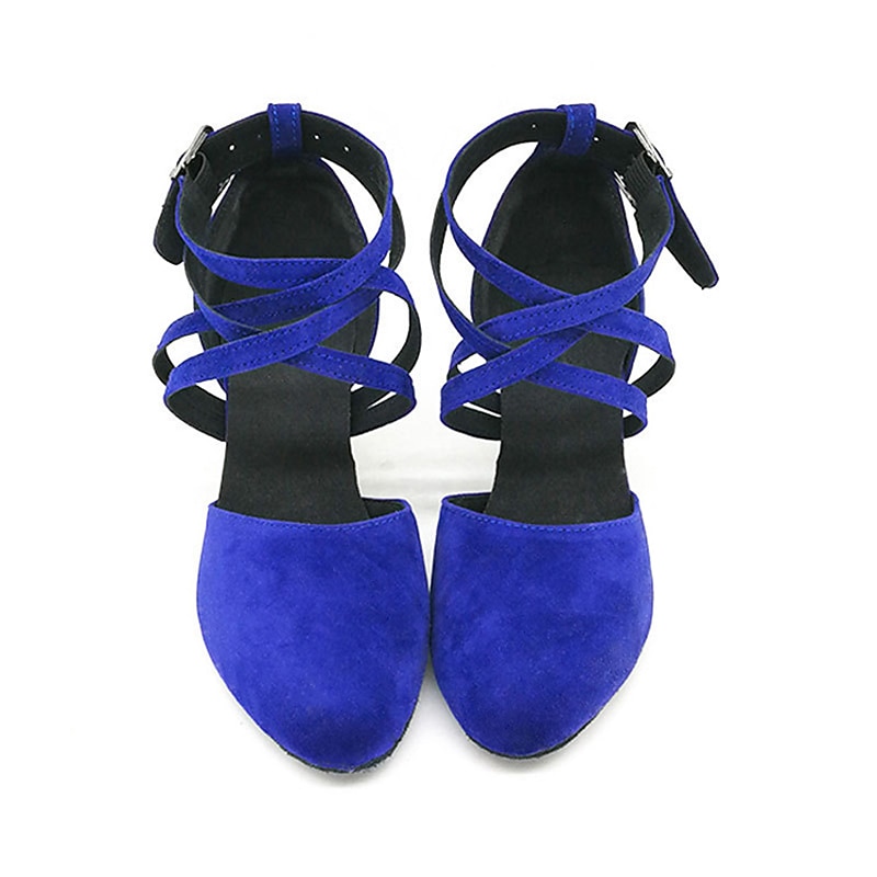 Highlights [Fabric] Constructed with high-quality suede, these ballroom shoes provide a luxurious and soft texture that gracefully contours the foot, ensuring both comfort and elegance during every dance step. [Silhouette] These shoes feature a classic round toe design complemented by a Cuban heel, offering stability and style for modern and ballroom dance enthusiasts seeking a chic and comfortable fit. [Design Highlights] The elegant royal blue shoes boast a criss-cross strap detail that enhances their aesthetic appeal while ensuring a secure fit. The adjustable metal buckle facilitates easy closure, and their mid-height heel offers a perfect balance of height and comfort ideal for long dance sessions. [Occasions] Perfect for ballroom dance practices, waltz, and glamorous evening parties. These shoes cater to various occasions requiring a blend of style and function, allowing you to perform with confidence in any setting. [Size Notice] Available in sizes ranging from 35 to 42, these shoes maintain standard sizing, allowing you to select your usual size for a precise and comfortable fit.