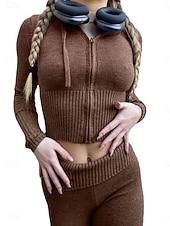 More information about Women's Fashion Streetwear Pants Sets Bolero Top Long Sleeve Hooded Solid Color Zipper Outdoor Work Casual Pink Blue Brown Spring Regular Fit