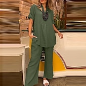 More information about Women's Fashion Streetwear Shirt Linen-Inspired Sets Two Piece Sets Linen Pants Pants Trousers Short Sleeve V Neck Solid Color Daily Wear Date Green Khaki Light Blue Spring Regular Fit
