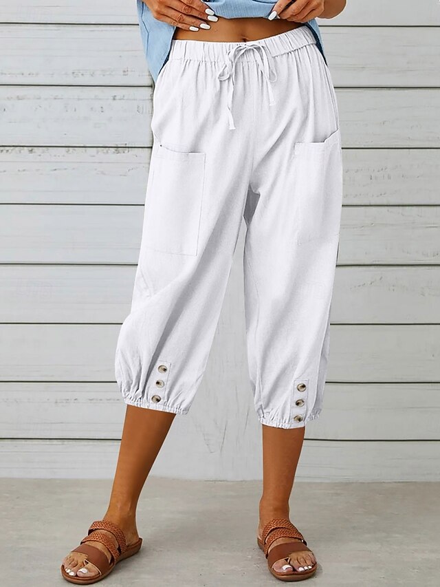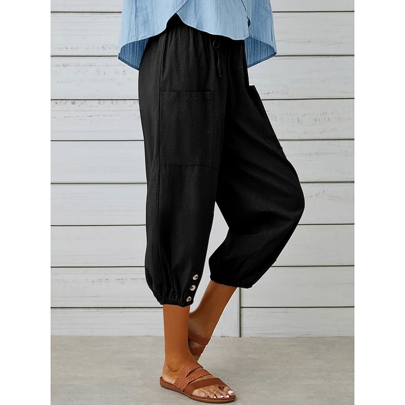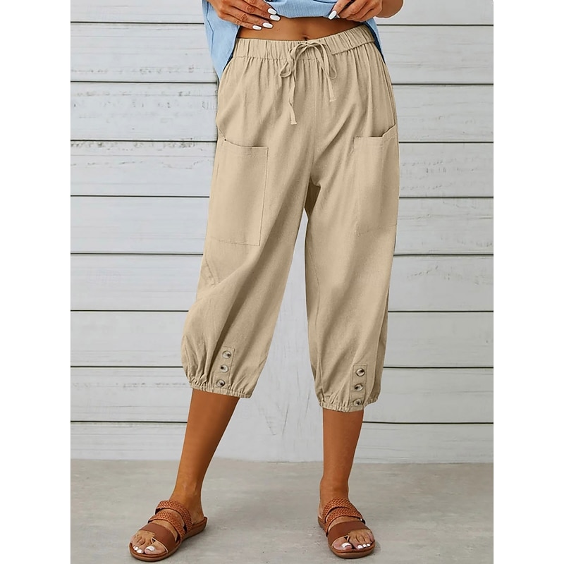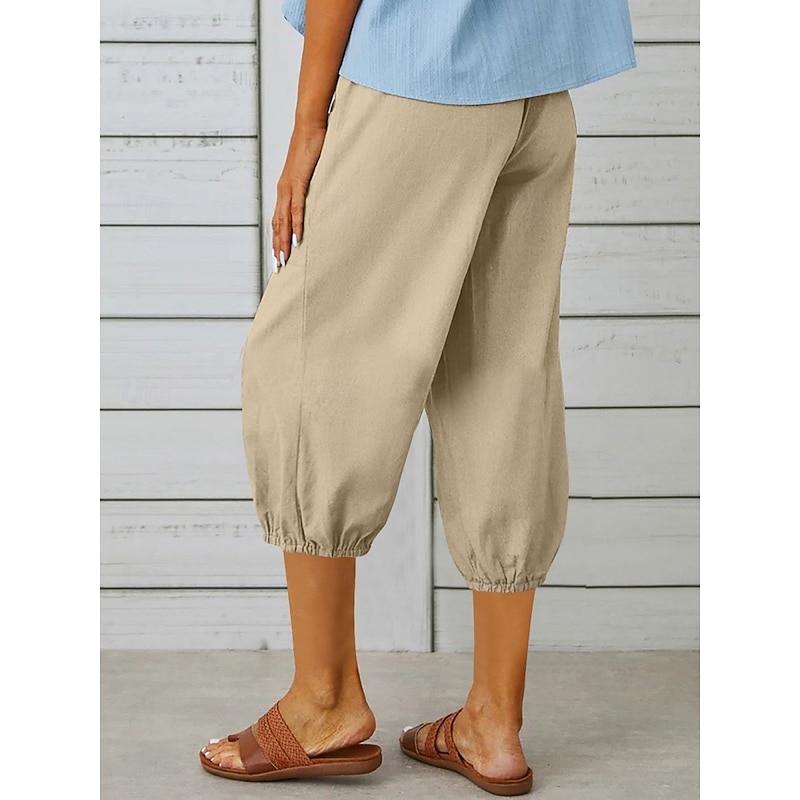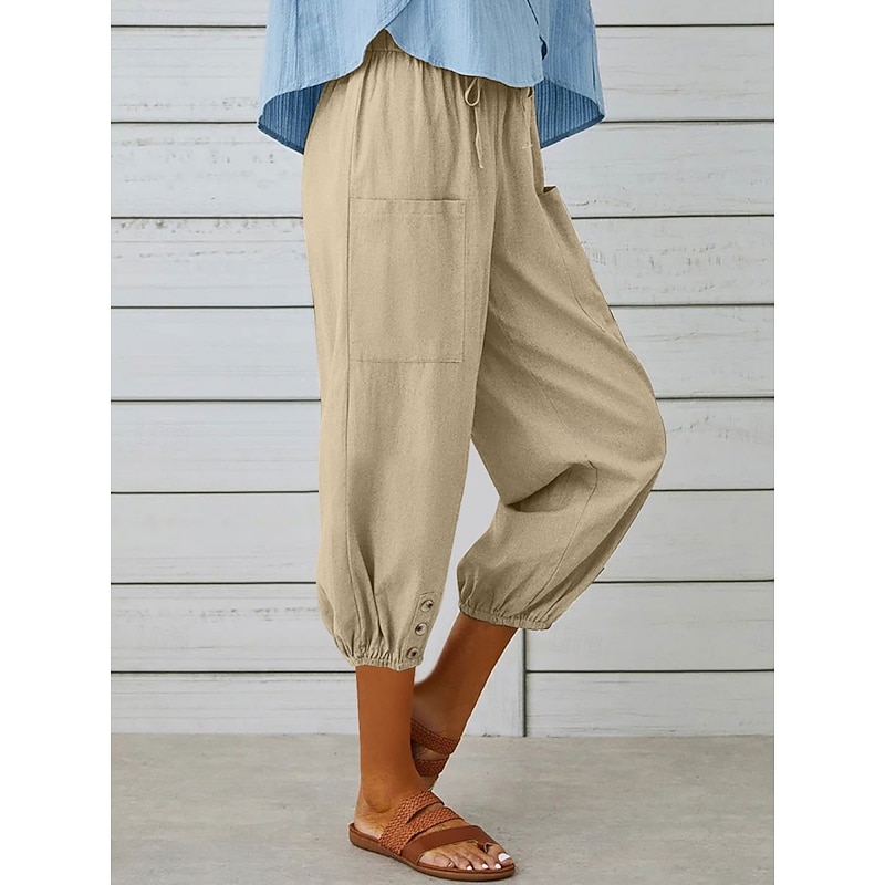 More information about Women's Capri Pants Solid Color Chinos Fashion Ethnic Style Basic Calf-Length High Waist Plain Pocket Drawstring Comfort Outdoor Micro-elastic Vacation Street Daily Black White Khaki Light Blue