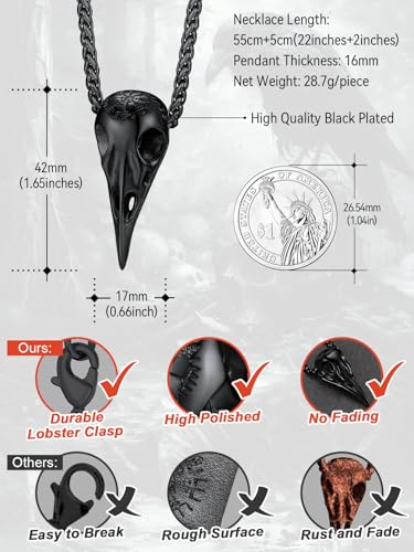 • Pendant Size--The size of this raven skull necklace is 1.65*0.66 inches. This Viking pendant can be worn with a chain up to 4mm wide.