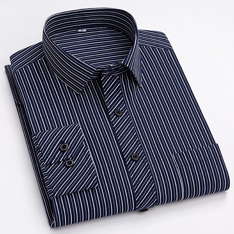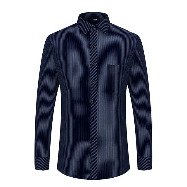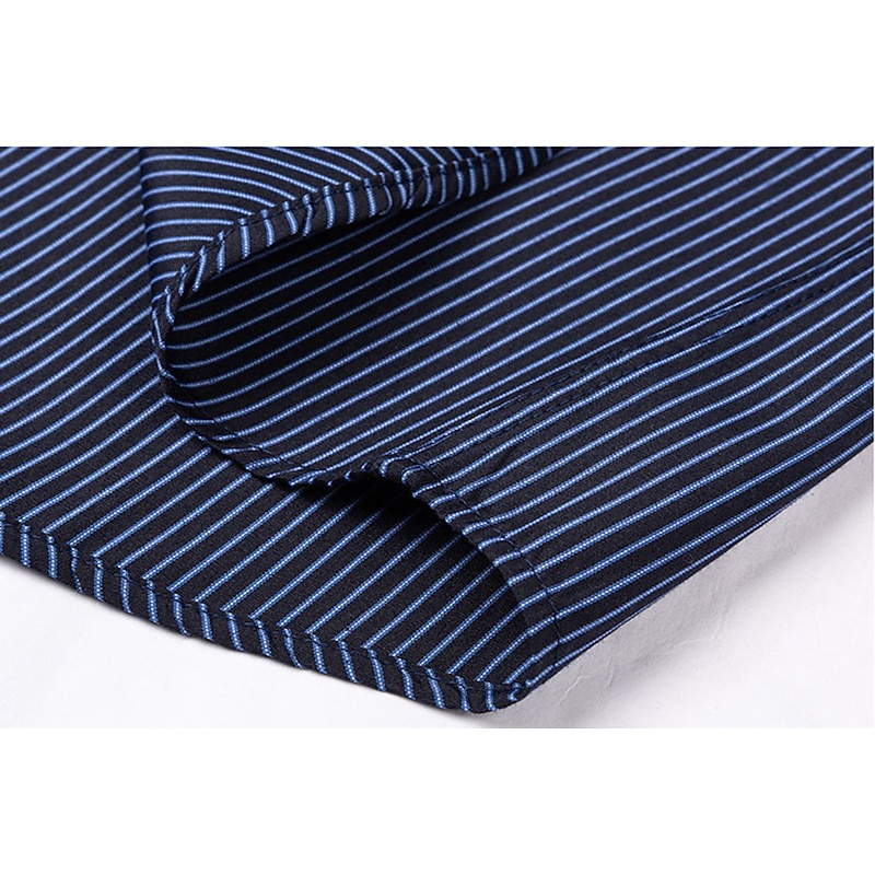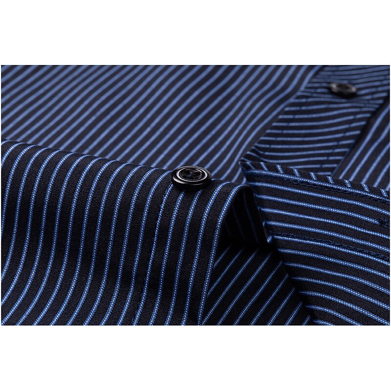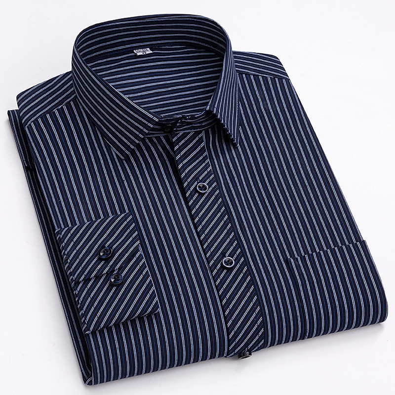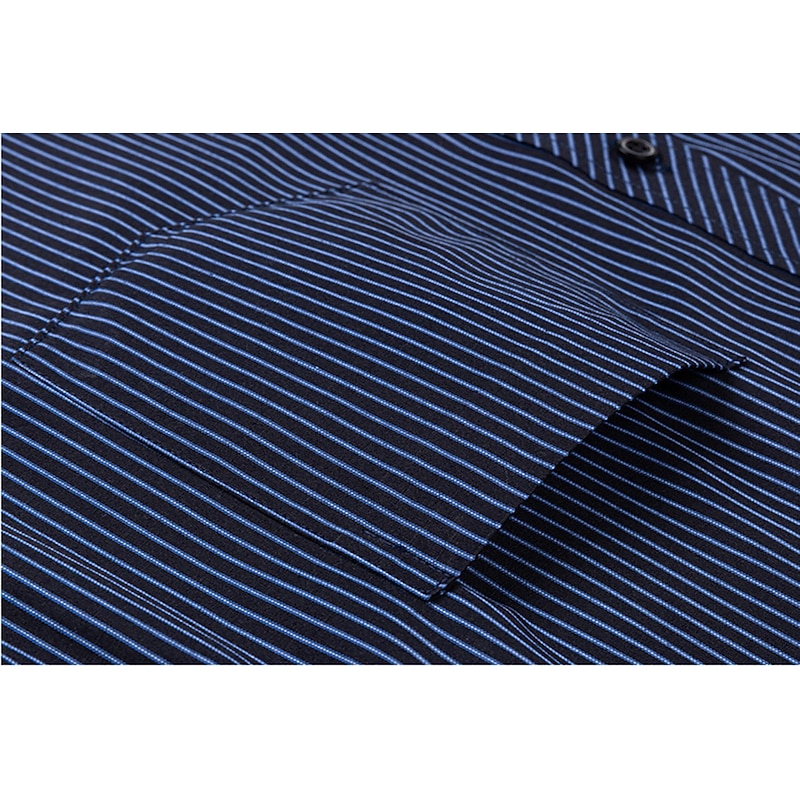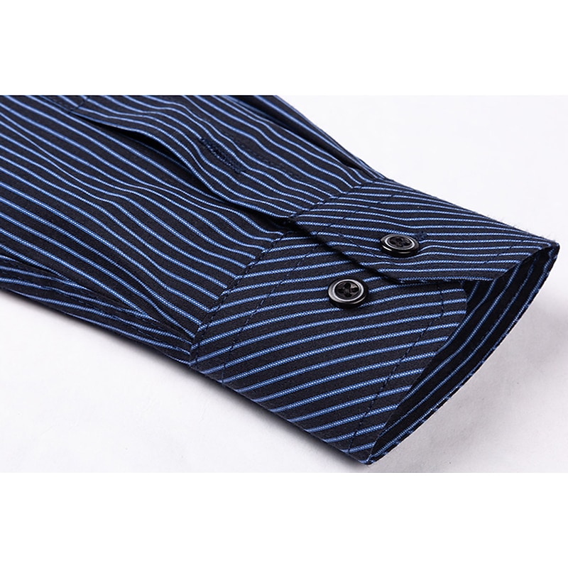 Highlights [Fabric & Fit:] Crafted from a comfortable and durable blend of 65% polyester and 35% cotton, this men's dress shirt offers a lightweight feel perfect for all seasons. The slim-fit design emphasizes a sleek, tailored look, ensuring you look sharp on any occasion. [Design Highlights:] This shirt is styled with a classic collared neckline and long sleeves featuring buttoned cuffs, adding a refined touch. The sophisticated navy blue shade with elegant vertical pinstripes provides a modern twist to a traditional look. A functional front chest pocket adds practicality without sacrificing style. [Occasions:] Whether you’re headed to a wedding, a day at the office, or just a casual outing, this versatile dress shirt adapts effortlessly. Pair it with dress pants for a formal setting or jeans for a more relaxed yet classy appearance. [Size Range:] Available in sizes ranging from S to 2XL, catering to a wide range of fits and preferences, ensuring every man can find his perfect fit. [Care Instructions:] Easy to care for, this shirt is machine washable, maintaining convenience and a crisp appearance with its non-iron fabric.